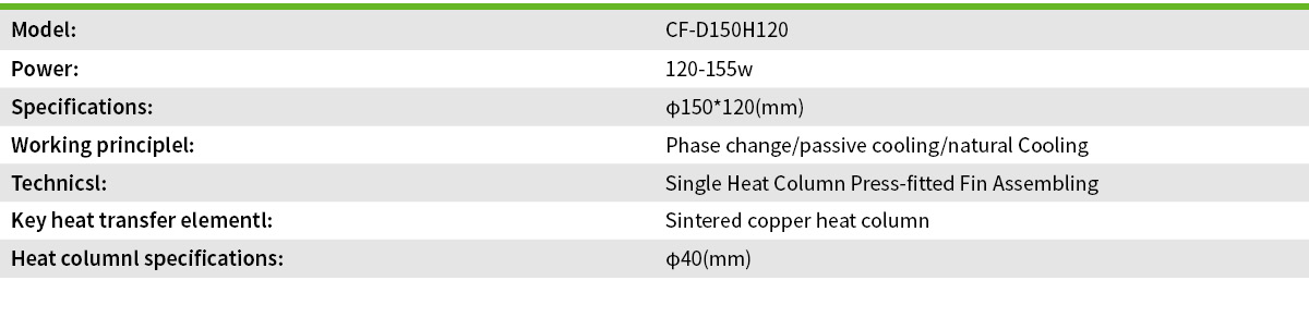 Structural and Systematic Design Benefits The heat sink’s design employs a modular single heat column structure fabricated from sintered copper, which is a patented technology known for high thermal conductivity. The press-fitted fin assembly enhances structural integrity, ensuring durability under mechanical stress typical in stage and studio environments. The compact dimensions (Φ150mm x 120mm) allow easy integration into varied lighting chassis without significant design modification. Supporting passive cooling through the phase-change principle optimizes heat transfer while eliminating the dependency on active cooling components. This design architecture facilitates OEM and ODM customization, making it adaptable across a broad spectrum of 120-155W stage lights/photography lights/video lights heat sink applications.